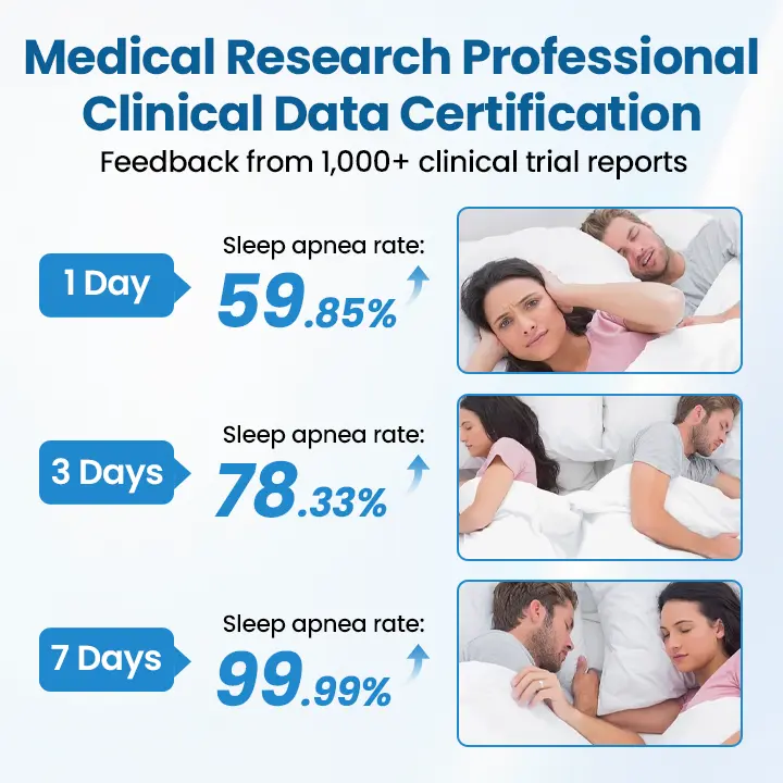 🔬Clinically Validated: In a clinical study led by the European Respiratory Health Center with 428 moderate-to-severe snorers: