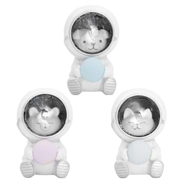 A cute figurine that burns in various colors. Use as a night light or as a display on any desk/desk. It features an adorable pet holding a flaming moon in an enlarged helmet.