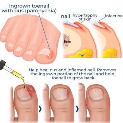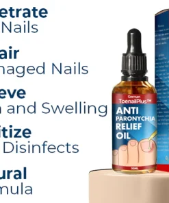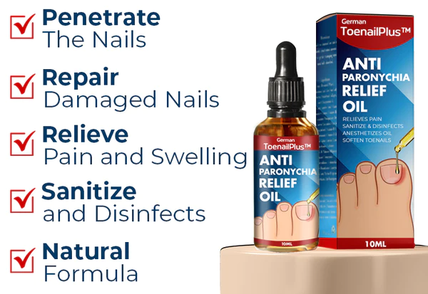 The Lotmay™ German ToenailPlus Anti Paronychia Relief Oil treats and eliminates causative germs, softens buried toenails and calloused tissue, inhibits ingrown toenails, promotes healthy nail renewal, and straightens the nails.