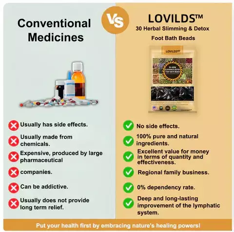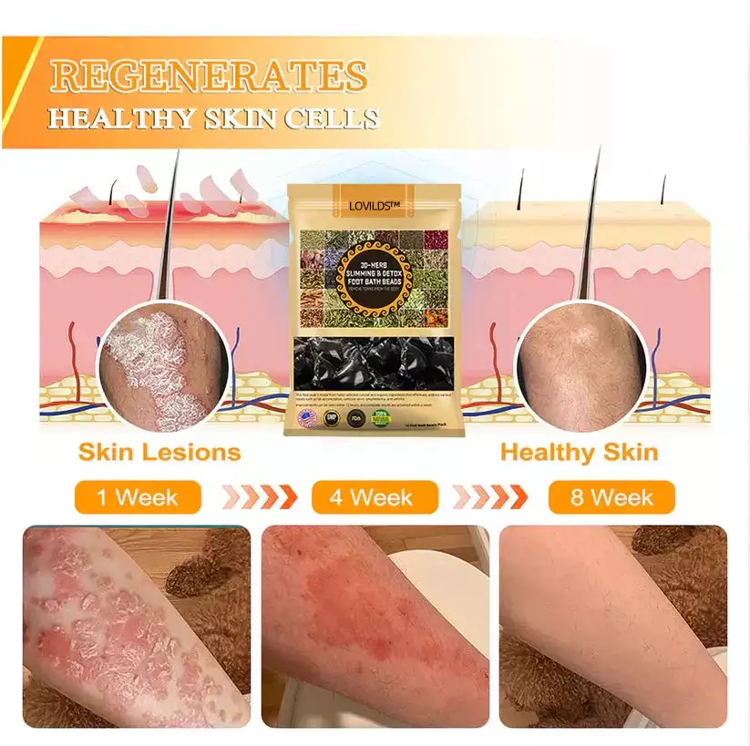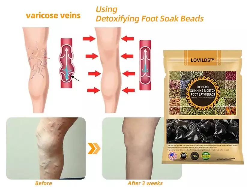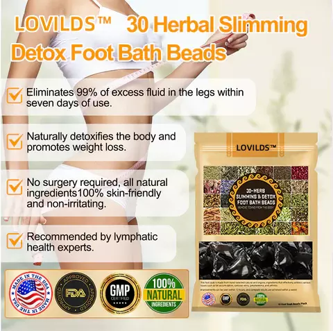 LOVILDS™ foot bath beads are designed to target key reflex points on the soles of your feet, helping to improve blood and lymph circulation, relieve swelling, and promote natural weight loss and detoxification. These beads are formulated with 30 natural herbal extracts, each chosen for its detoxifying, anti-inflammatory, and fat-burning properties. The herbs work synergistically to support lymphatic drainage, reduce varicose veins, and enhance overall wellness.