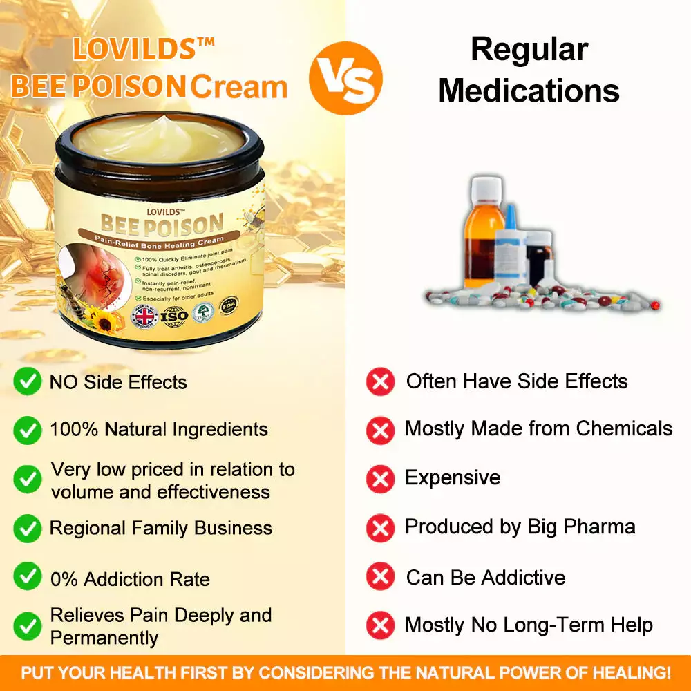 It looks like you’re sharing a detailed marketing message for a product called LOVILDS™ Bee-Poison Pain-Relief Bone Healing Cream, which is positioned as a natural treatment for joint and bone pain. It highlights its ingredients, benefits, customer testimonials, and endorsements from experts.