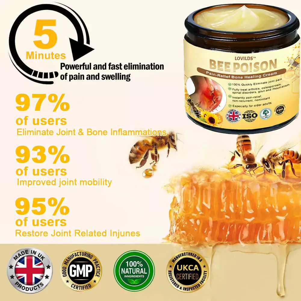 - The product includes ingredients like bee poison filtrate, glucosamine, arnica extract, MSM, and chondroitin, which are said to help reduce inflammation, support cartilage repair, and ease pain.