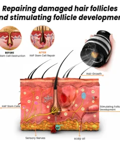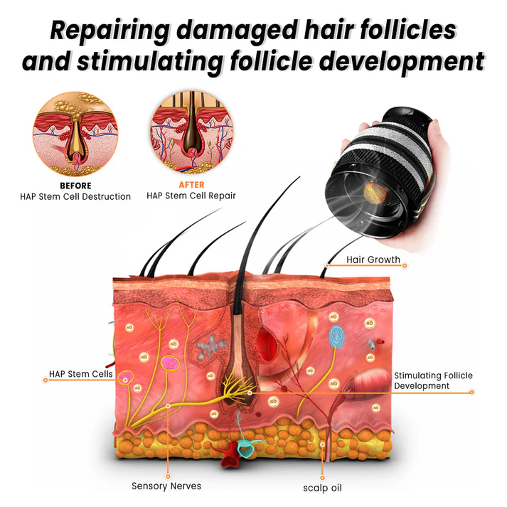 Wormwood is rich in anti-inflammatory and anti-bacterial ingredients, and the LUHAKA™ Moxibustion Hair Regrowth Device repairs hair follicles damaged by DHT while inhibiting bacterial growth, effectively preventing recurring hair loss. Nitric Oxide (NO) produced by the Moxibustion Device and the increase in local circulation help to reduce the level of inflammatory cytokines while promoting the repair of DHT-damaged HAP stem cells⁷. The main role of these HAP stem cells is to promote the growth of sensory nerves in the hair follicle, which in turn improves the nutritional status of the hair and stimulates hair growth.