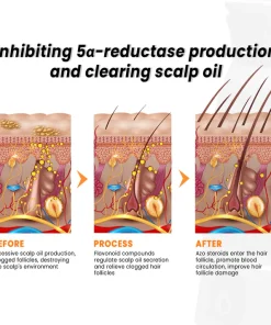 The LUHAKA™ Moxibustion Hair Regrowth Device utilizes the heat generated from burning moxa cones to swiftly open and penetrate hair follicles. Once burned, moxa cones contain various flavonoid compounds, including catechins, anthocyanins, gallic acid, and rutin⁵. These compounds regulate scalp oil secretion, eliminate accumulated oil in hair follicles, and alleviate follicle blockage. Upon entering the hair follicle, the production of azo steroid aids in promoting local blood circulation. Simultaneously, it inhibits the body’s production of DHT by reducing the 5α reductase enzyme, thereby enhancing the scalp environment and preventing hair follicle damage.