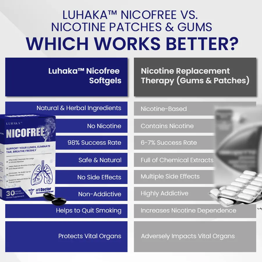 Unlike traditional nicotine-replacement options like patches or gum, which use synthetic nicotine, Luhaka™ Nicofree takes a natural and holistic approach. Its carefully formulated blend of herbal ingredients helps detoxify the body, reduce cravings, and ease withdrawal symptoms—without relying on addictive substances.