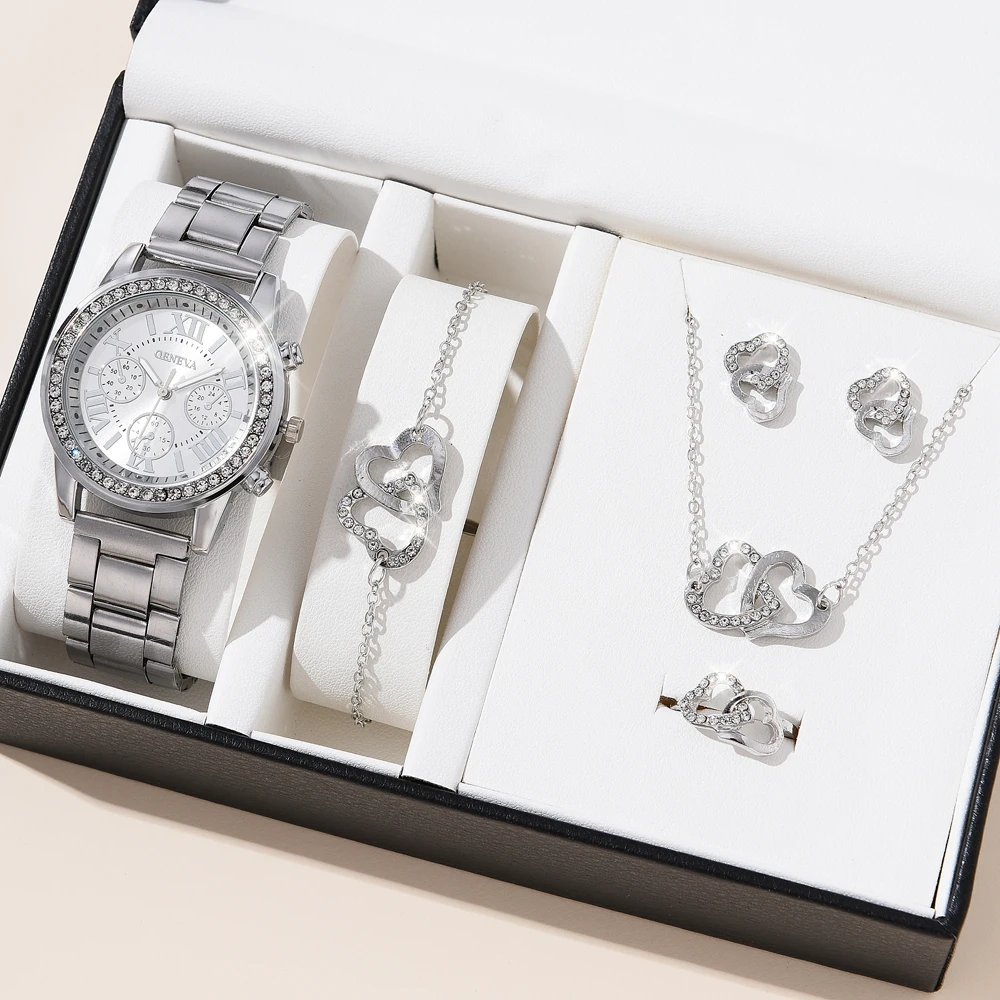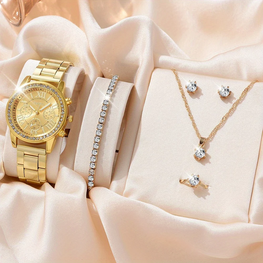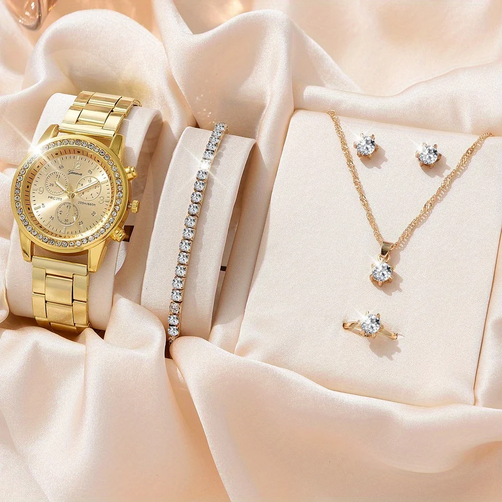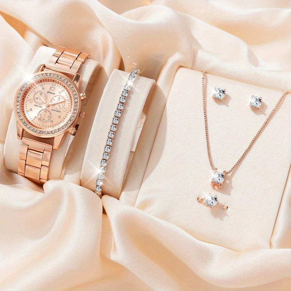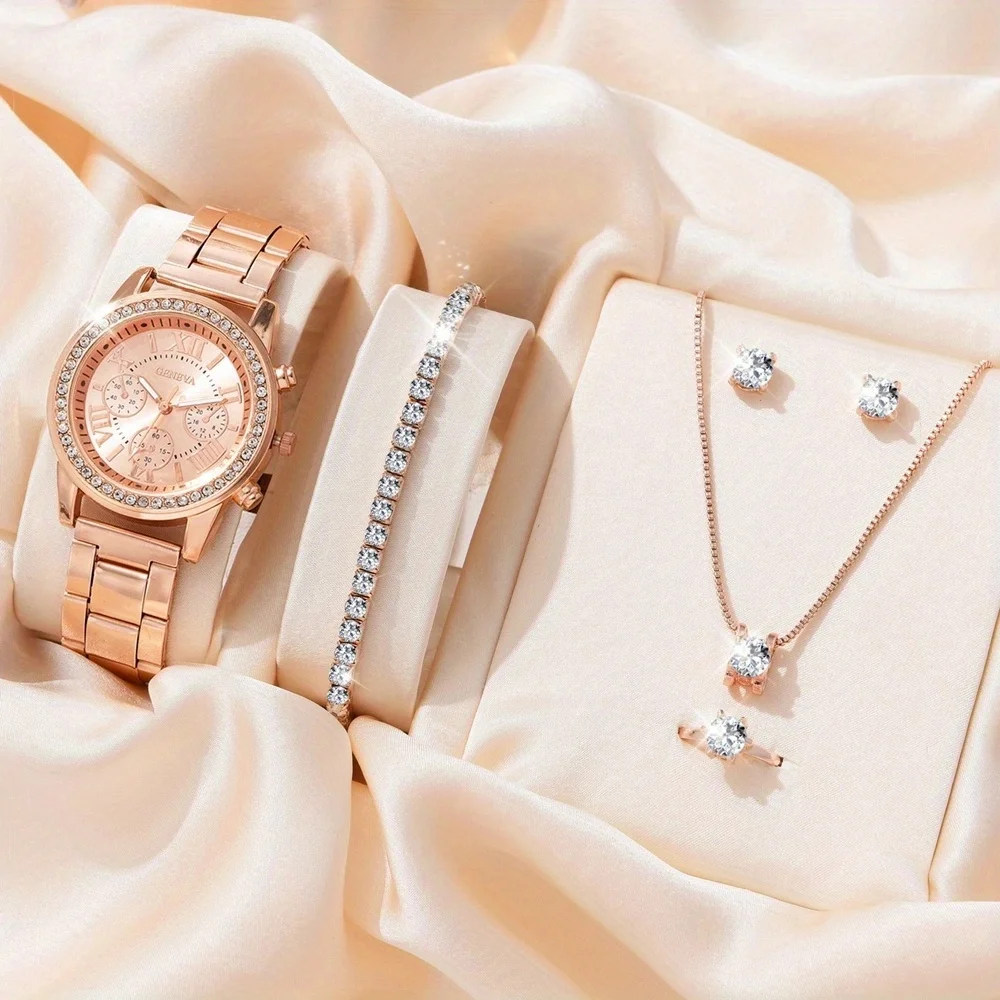 6PCS Set Luxury Watch Women Ring Necklace Earrings Rhinestone Fashion Wristwatch Female Casual Ladies Watches Bracelet Set Clock