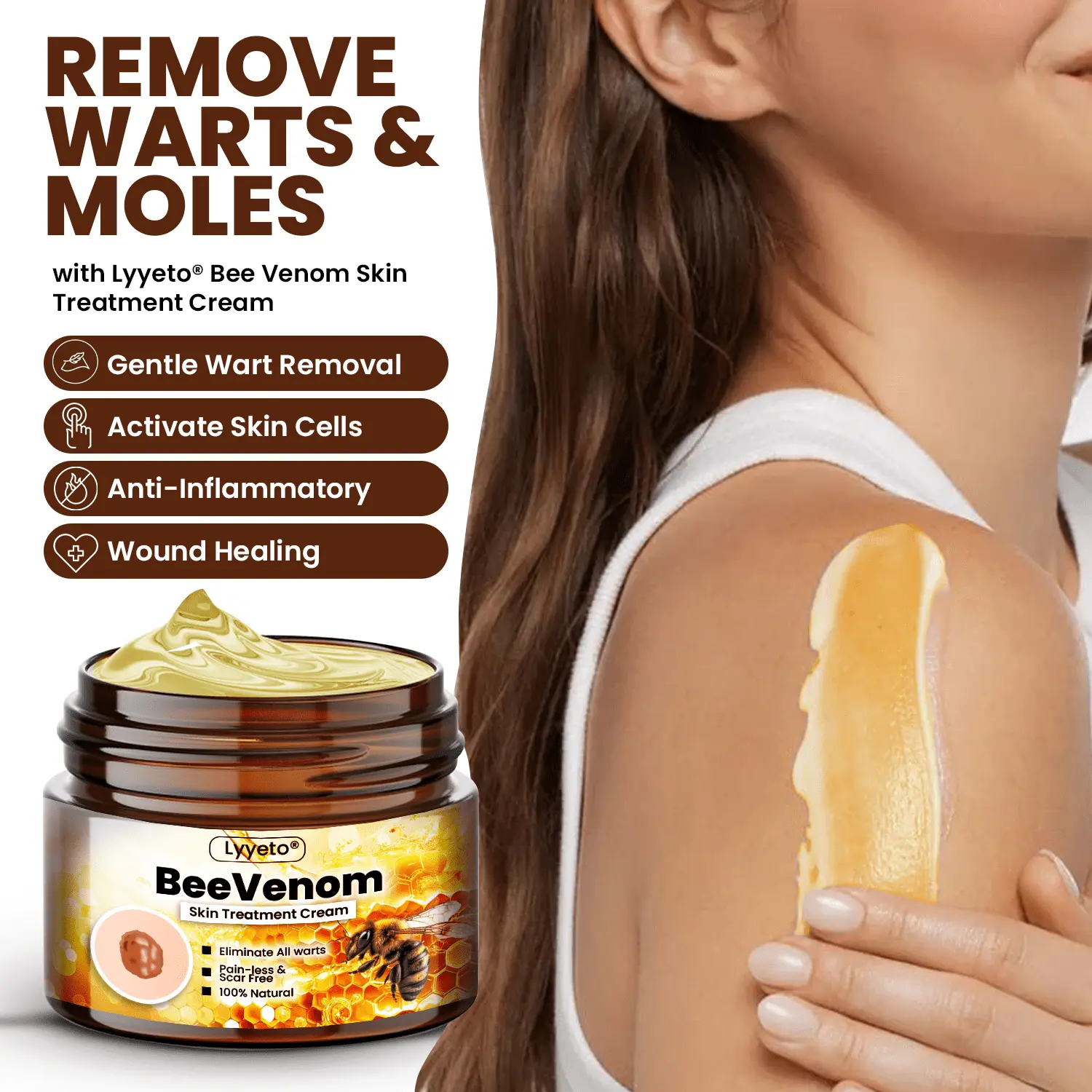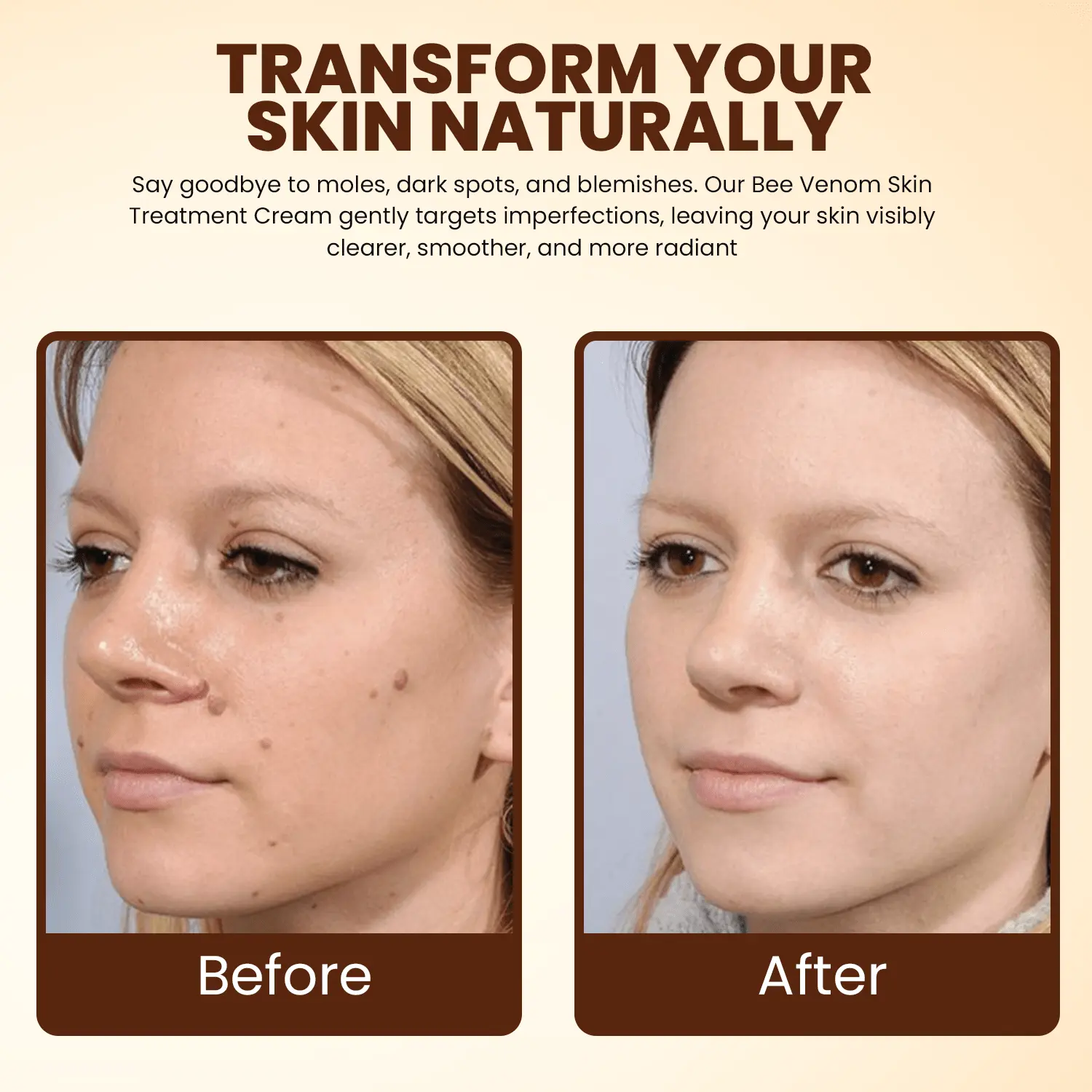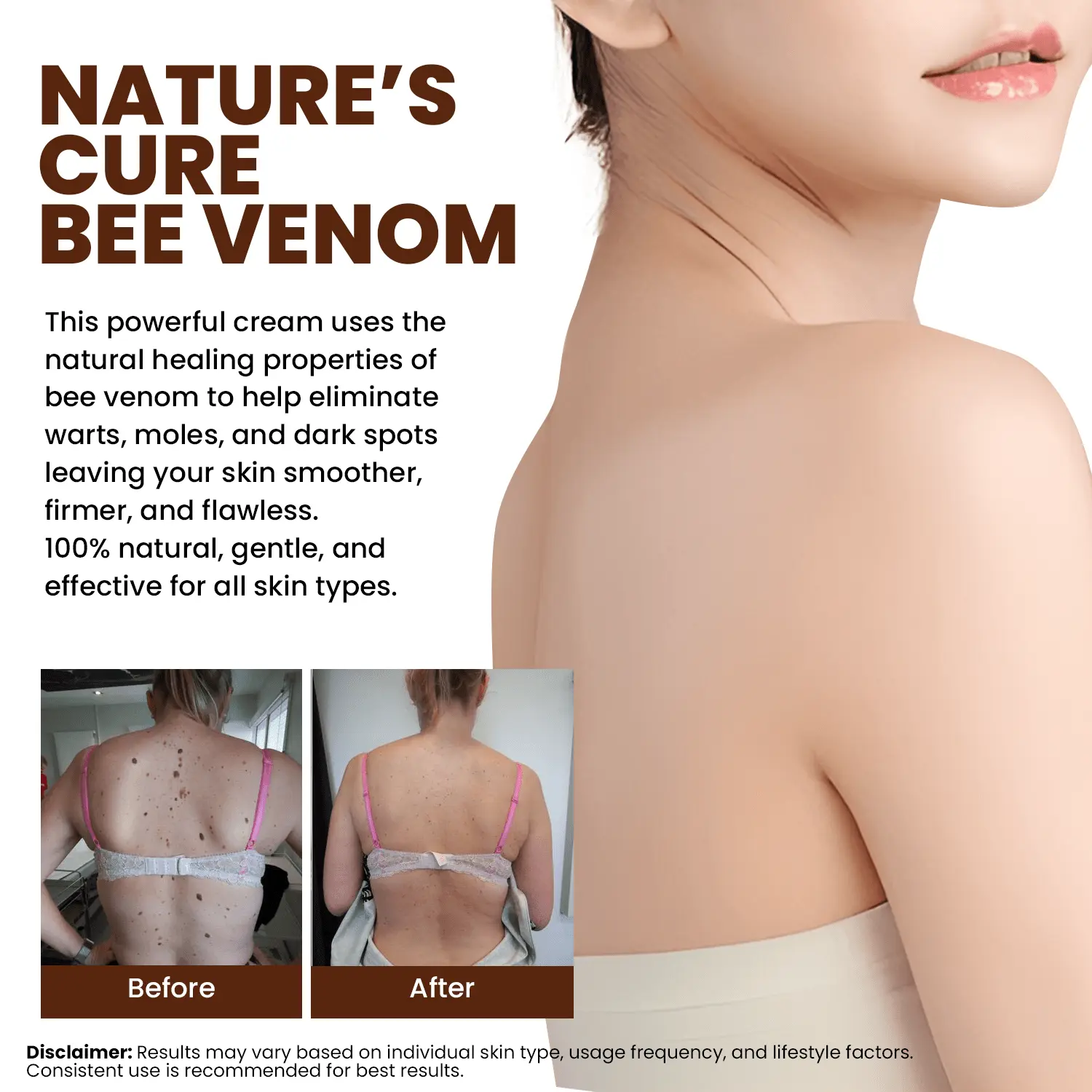 Unlike typical creams that only treat the surface, this advanced formula works deep within the skin to heal and restore from the inside out. Infused with natural bee venom, it stimulates collagen production, boosts blood circulation, and promotes skin cell renewal. These powerful actions help clear acne, fade scars and stretch marks, soothe eczema, hives, and psoriasis, and reduce the appearance of wrinkles, moles, skin tags, and dark spots like chloasma.