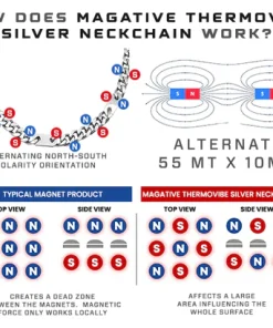 The MAGATIVE Thermovibe Silver Neck Chain uses Alternating North-South Polarity Orientation to maximize magnetic field flux, while also releasing electromagnetic charge to clear blockages in the body and restore a natural flow of energy.