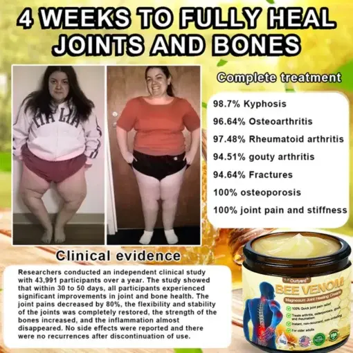 Ourlyardยฎ Magnesium & Bee Venom Pain-Relief Bone Healing CreamThis product is certified and recommended by the American Academy of Orthopaedic Surgeons (AAOS), meeting their high standards to effectively relieve pain and promote bone health.ย Approved by orthopedic doctors, it relieves pain within 5 minutes, restores joint mobility in 7 days, and significantly improves arthritis symptoms in 4 weeks.ย Choose our Botulinum Toxin & Bee Venom Pain Relief Bone Healing Cream and enjoy reliable results and a pleasant experience with confidence.