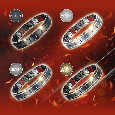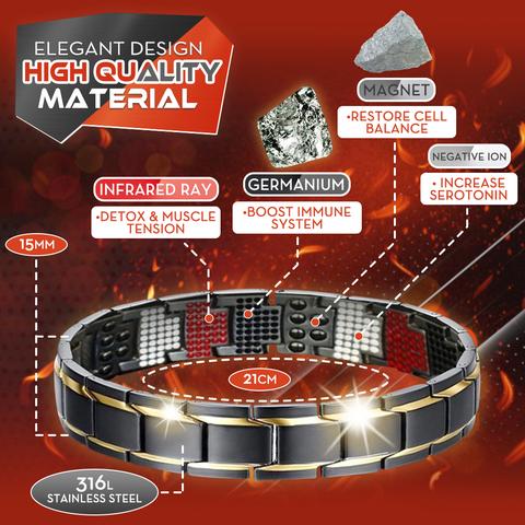 Magnetic therapy is an effective alternative medicine consisting of 4 powerful healing minerals including germanium, magnet, infrared and negative ion tablets that relieve pain, reduce inflammation, improve circulation and restore positive energy. It is made of high quality alloy and magnets, classical silver color connection, beautifully polished with shiny and smooth gold and silver color lines along the edges, no one knows it is embedded with magnets, used for sports joint pain, promotes relaxation, stabilizes sleep.