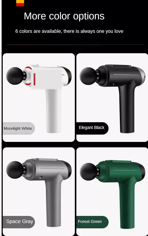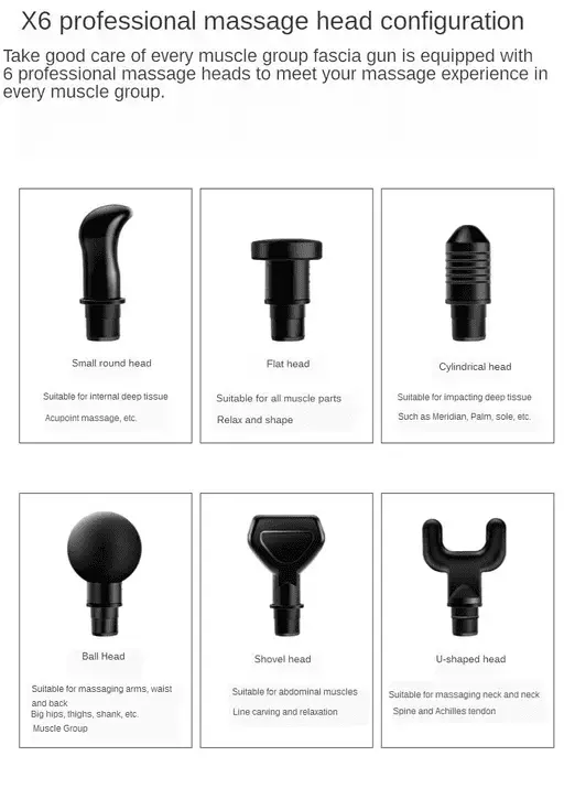 The massager is equipped with 6 different shaped massage heads, which can help users relax different parts of the body. The front fork massage head is designed for the spine; flat, any part of the body; bullet head for joints; first round for large muscle groups; users can change the speed of the massage gun as needed.