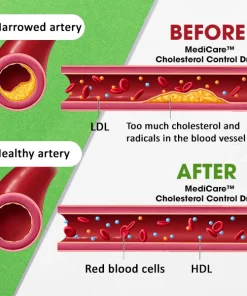 MediCare™ Cholesterol Control Drops contain compounds that promote the excretion of cholesterol from your body. These compounds enhance the removal of cholesterol through the liver, leading to a further reduction in LDL cholesterol levels. Furthermore, the drops support the healthy functioning of your cardiovascular system by providing antioxidants and essential nutrients. These components help protect your blood vessels from oxidative damage and promote optimal heart health.