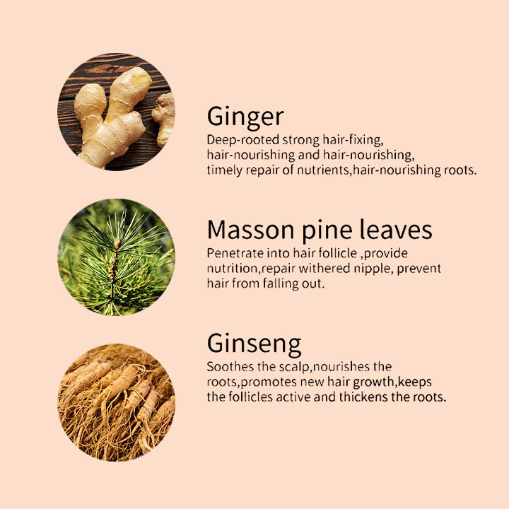 - Core ingredients: 5% Minoxidil, Ginger root extract, Masson pine leaf extract, Ginseng extract