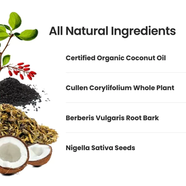 - Main ingredients: Certified Organic Coconut Oil, Nigella Sativa Seeds, Berberis Vulgaris, Cullen Corylifolium