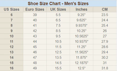 - Sizes in US: 5, 6, 7, 8, 9, 10, 11, 12