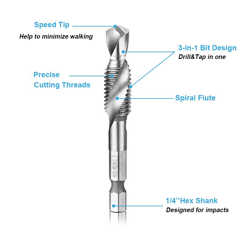 If you apply an electric hand drilling machine to do the tapping job, please pay attention to your operating, because excessive shaking and tilting may affect the result and even break the bit.