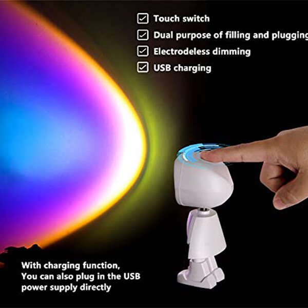 Create a romantic atmosphere, suitable for children’s bedroom, living room, party, wedding, stage backlight. Our rainbow/sunset projection floor lamp with USB power supply, rechargeable, adjustable brightness, touchscreen, removable lamp cover, 360° Swivel cable, long USB cable. Ideal for soft lighting, lighting and photography or vlogging.