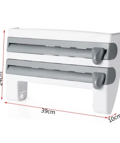 The Multifunctional 4-in-1 Kitchen Dispenser is the easiest way to store and dispense your most frequently used kitchen rolls: cling film, aluminum foil and paper towels.