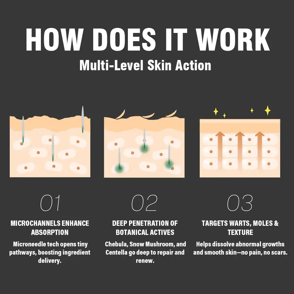 Formulated with ultra-fine micro-reedle technology and a botanical power blend—featuring Chebula, Snow Mushroom, and Centella—it penetrates deep beneath the skin to dissolve growths at the source.