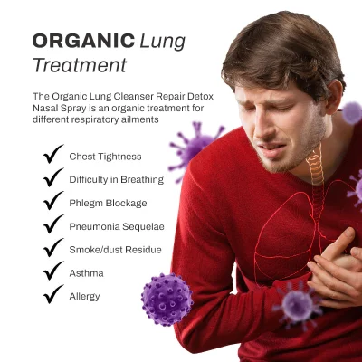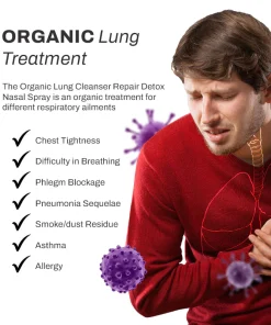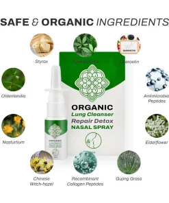 Organic LungCleanser RepairDetox NasalSpray is inhaled through the nose, then absorbed through the trachea, stimulating and diluting mucus in the trachea and lungs and helping expel phlegm and lung residues within 2 hours. It can also help correct your immune system to reduce allergic reactions through desensitization therapy, effectively treating respiratory allergies/asthma and other diseases.