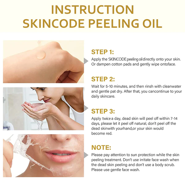 - Apply the Skincode peeling oil directly to your skin. Or dampen cotton pads and gently wipe the face.