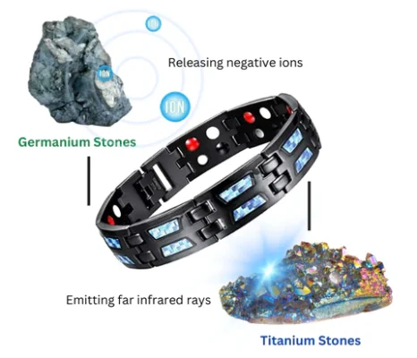 The Oveallgo™ Titanium Therapy Bracelet works through two key mechanisms – Germanium negative ion emission and Blue Titanium Therapy.Germanium is a semi-metal element that has been found to emit negative ions. Negative ions are molecules that have gained an additional electron, giving them a negative charge. In the body, negative ions are believed to help neutralize harmful positive ions, which can cause oxidative stress and inflammation. These negative ions emitted by Germanium may help to restore balance in the body and promote healthy blood pressure levels.