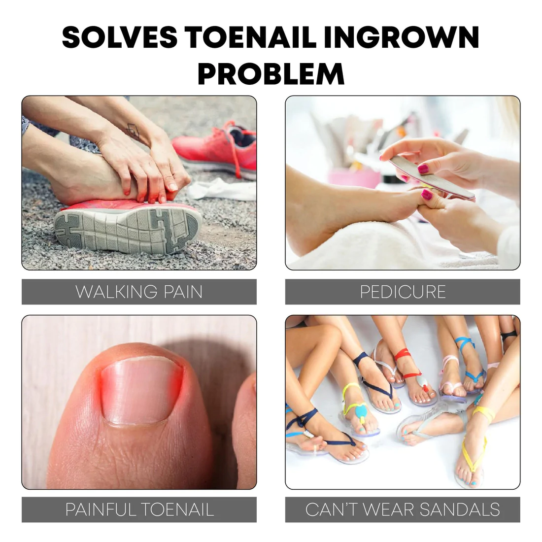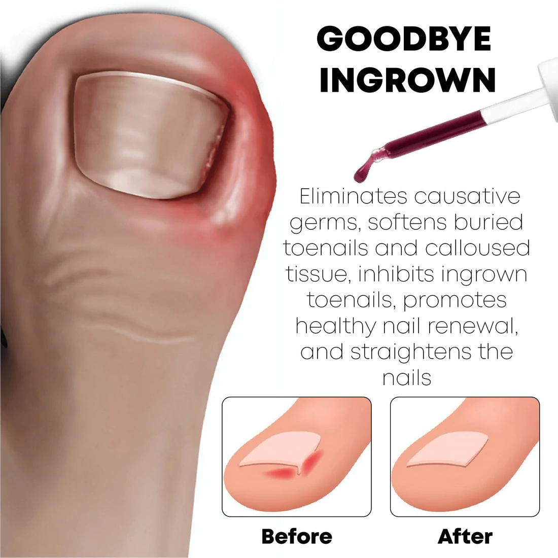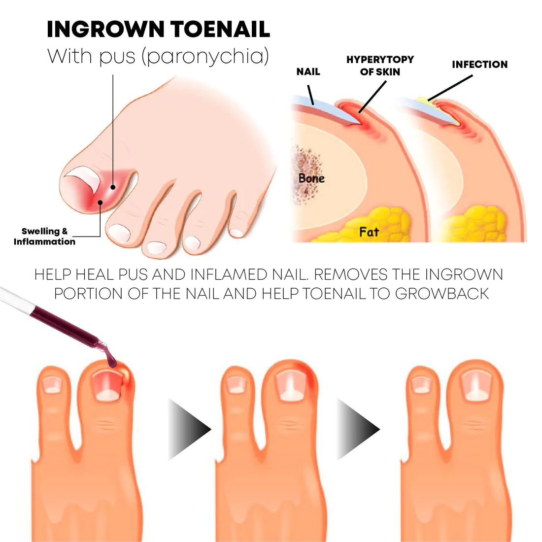 PediPerfect AntiParonychia Relief Oil treats, eliminates, and prevents the cause of ingrown toenails and calloused tissue, softens buried toenails and calloused tissue, inhibits ingrown toenails, promotes healthy nail renewal, and straightens the nails.