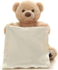 PEEK-A-BOO PLUSH BEAR: Peek-A-Boo Bear recites one of six different phrases while animated mouth and arms recreate peek-a-boo game. Features a satin-accented blanket that provides additional tactile sensation.