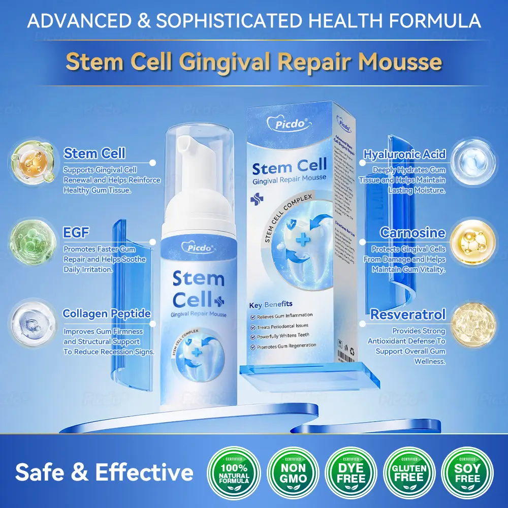 Multiple benefits: It can effectively address tooth pigmentation, tooth decay, periodontal and pulp inflammation, and support the repair needs caused by tooth defects.โ Scientific formula:๐๐ข๐๐๐จยฎ ๐๐ญ๐๐ฆ ๐๐๐ฅ๐ฅ ๐๐ข๐ง๐ ๐ข๐ฏ๐๐ฅ ๐๐๐ฉ๐๐ข๐ซ ๐๐จ๐ฎ๐ฌ๐ฌ๐ย utilizes stem cell activity and collagen regeneration technology to promote gum tissue repair, restoring its elasticity and supporting structure. It can achieve deep oral repair without injections or surgeries, enhancing tooth stability and overall oral health.