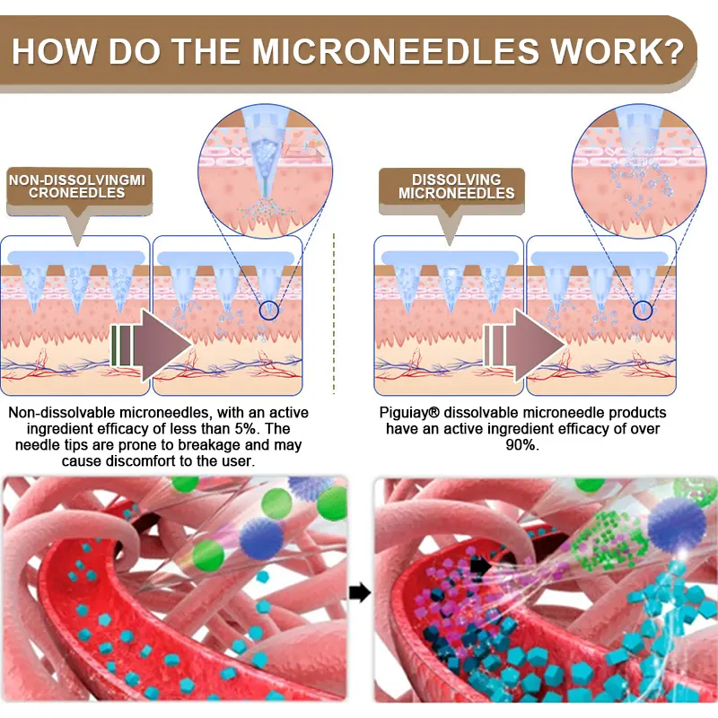 Each needle is 0.27mm long. just 1/7th the thickness of a hair. and is made from dissolvable medication. These micro-needles are precision-engineered using cutting-edge manufacturing techniques to ensure a seamless. pain-free experience while effectively delivering the active ingredients directly into the skin.