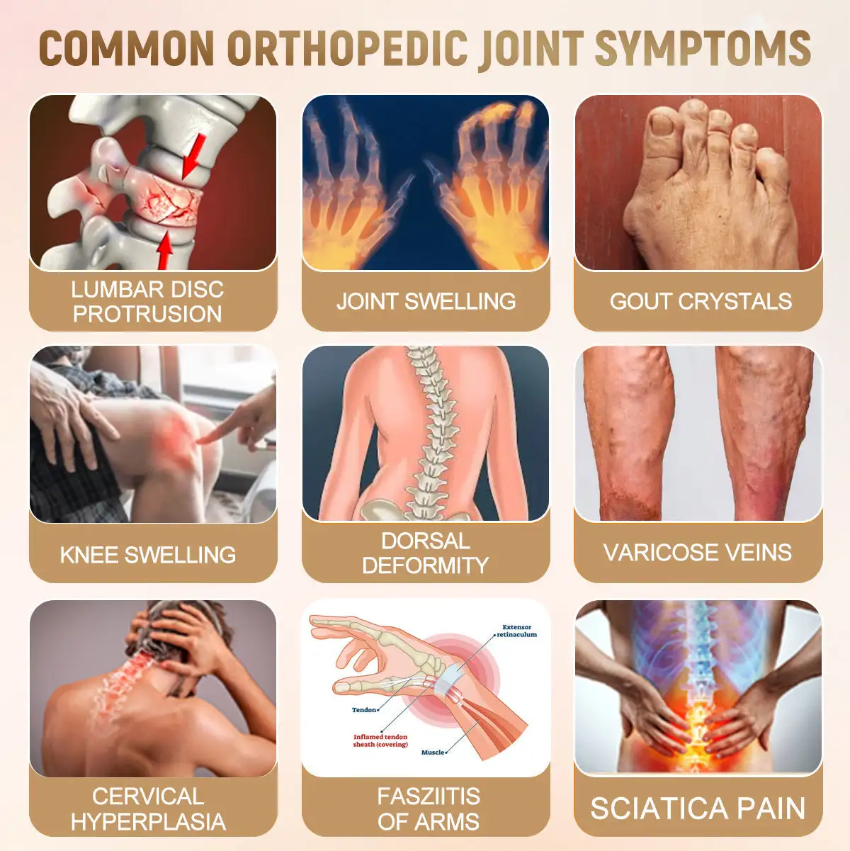 According to statistics, 35% of the global population suffers from joint issues, with 1 in every 5 people experiencing varying degrees of joint problems. Mild cases include conditions such as arthritis, rheumatoid diseases, and gout, with symptoms like pain, stiffness, swelling, difficulty moving, fatigue, and reduced range of motion. In severe cases, joint deformities, fever, and intense joint pain can occur, leading to chronic pain and disability. In the most severe cases, orthopedic diseases can trigger life-threatening complications.