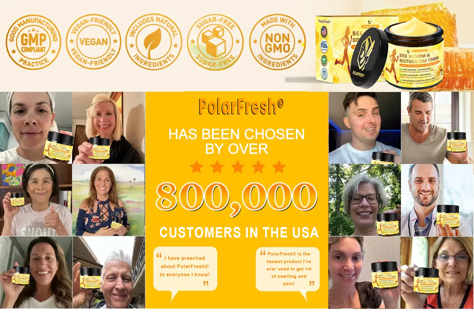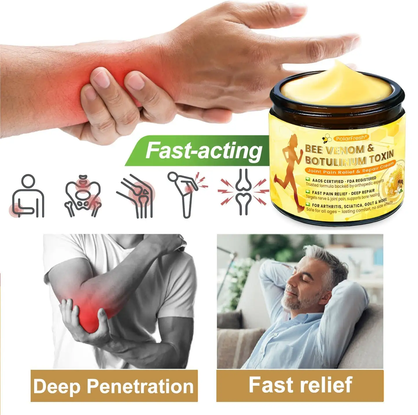 PolarFresh® Bee Venom & Botulinum Toxin Joint Pain Relief & Repair Cream contains six proven, powerful ingredients that have been used to effectively treat arthritis and bone-related conditions in millions of people around the world.