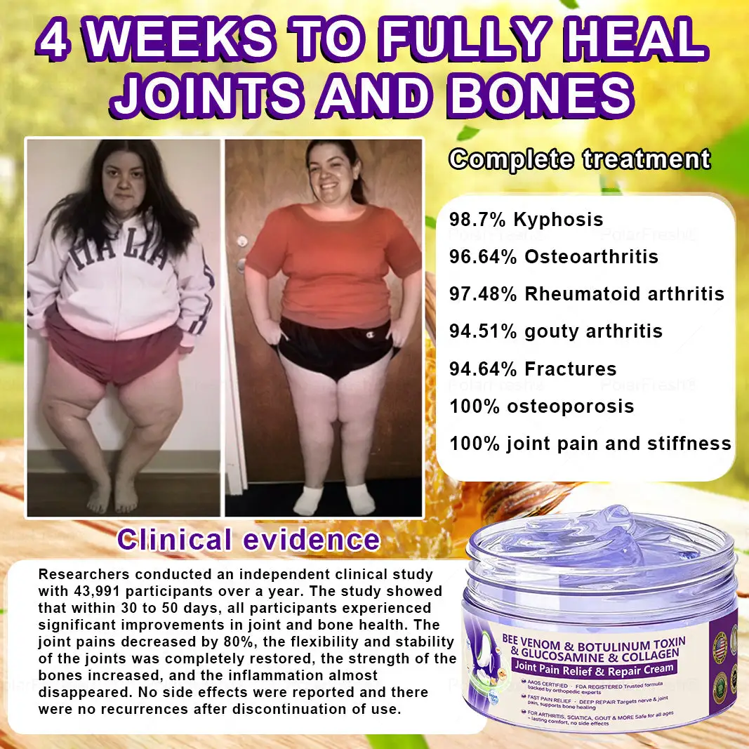 “For years, I struggled with constant knee pain and swelling—my friends used to joke that my knees looked like footballs. When I came across POLARFRESH® Botulinum Toxin & Bee Venom Pain-Relief Bone Healing Cream, I thought I’d give it a go, and it turned out to be the best decision! In less than three weeks, I noticed an incredible improvement—my knee pain eased significantly, and the swelling completely disappeared. Now, I feel like I’ve fully recovered, and this cream has truly made a difference in my life. I’m so grateful for it!”– Isabella Walker