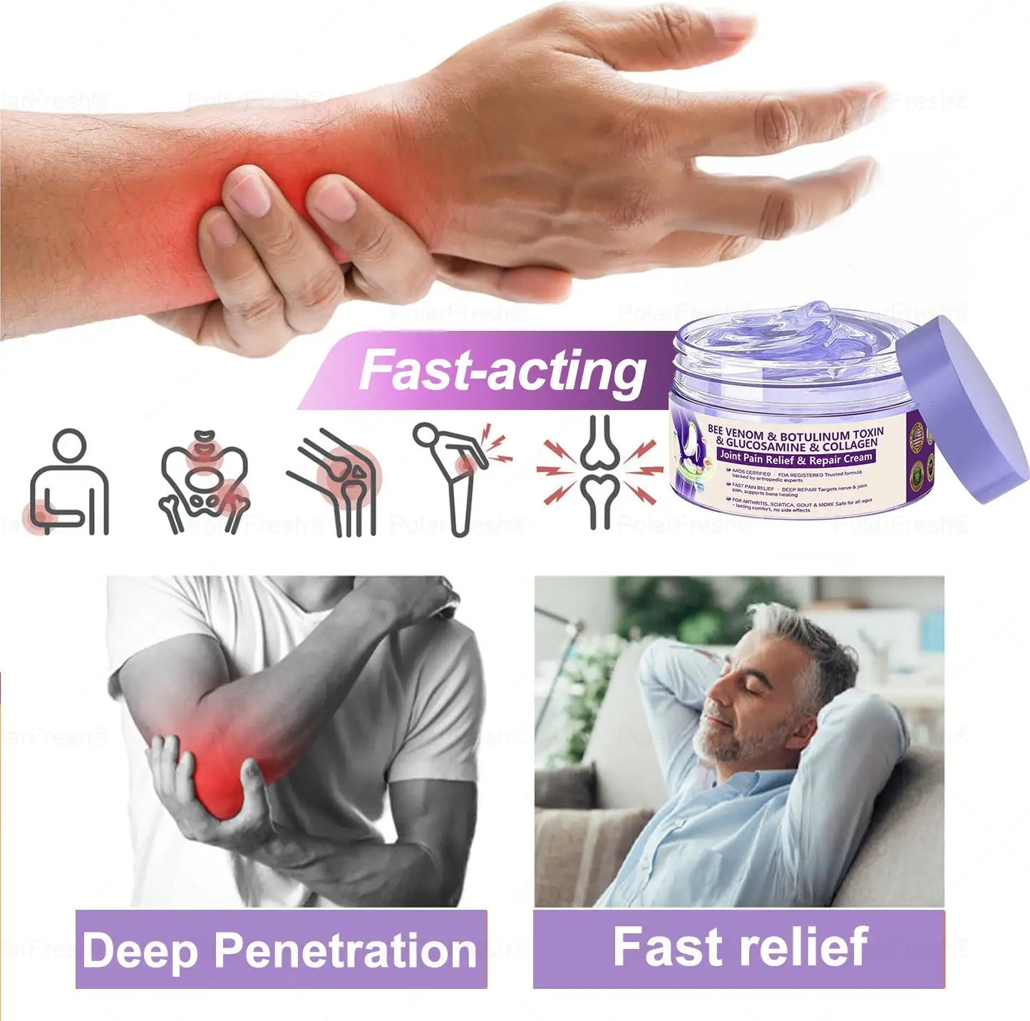 “I suffered from severe knee pain and swelling due to an old injury. The discomfort made it difficult for me to walk, climb stairs, or get through my day without pain. I had tried countless treatments and spent a fortune on physical therapy, but nothing provided lasting relief. Frustrated, I came across the POLARFRESH® Botulinum Toxin & Bee Venom Pain-Relief Bone Healing Cream and decided to give it a try. I applied it 2-3 times a 1day, and within just a few days, the swelling started to decrease, and the pain became much more manageable. After two weeks, my knee felt stronger, and I could walk without constant discomfort. Six weeks later, I was back to my usual activities, pain-free. This cream has changed my life and given me the mobility and freedom I thought I had lost forever!” – Noah Anderson