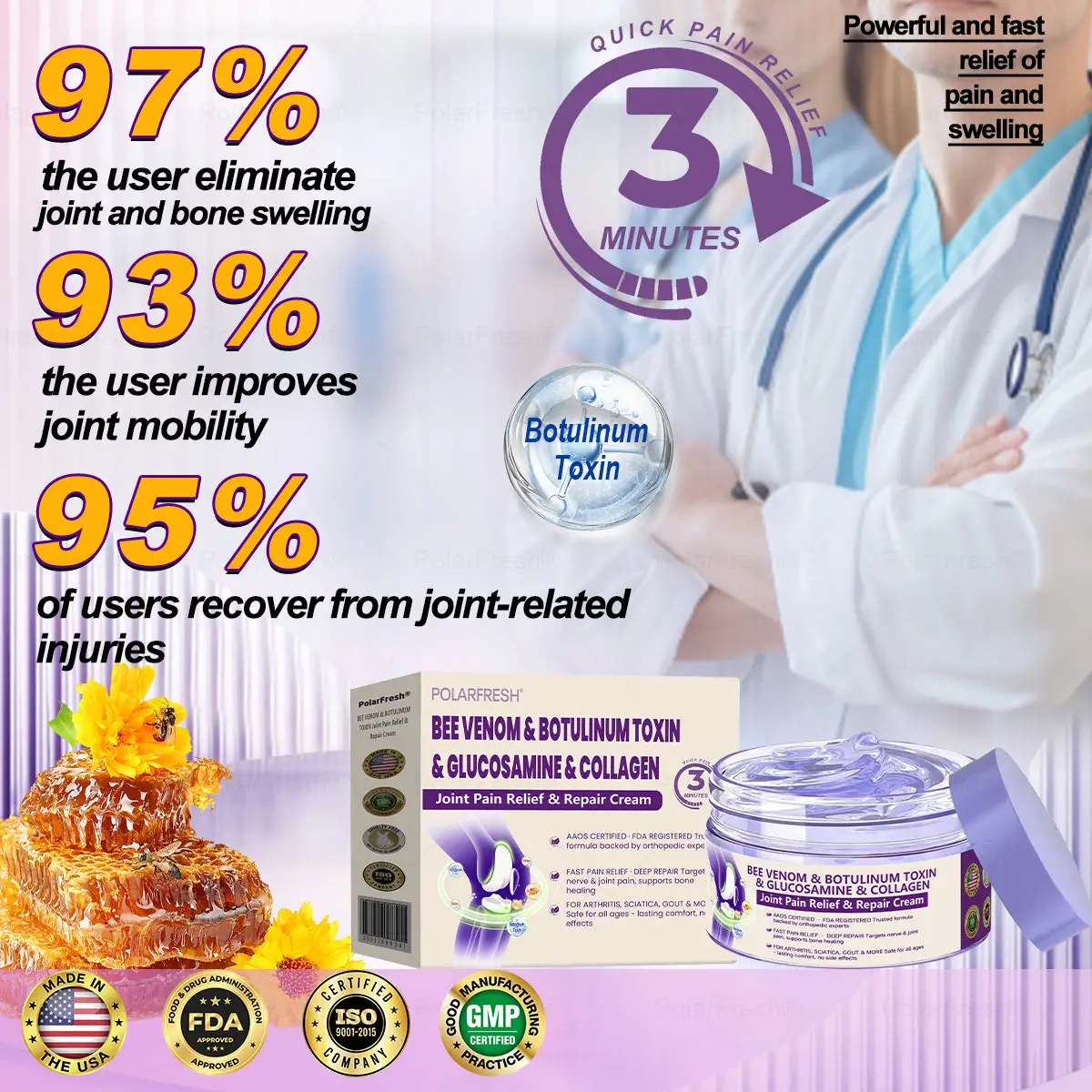 “As an orthopedic doctor, I highly recommend POLARFRESH® Botulinum Toxin & Bee Venom Pain Relief and Bone Healing Cream for patients suffering from osteoarthritis, rheumatoid arthritis, and other inflammatory joint and bone conditions. This cream contains botulinum toxin, bee venom extract, glucosamine, chondroitin, and other highly effective active ingredients that help reduce inflammation, nourish the joints, and enhance mobility. It also aids in rebuilding and restoring cartilage and bone tissue, relieving pain and stiffness, while eliminating harmful crystals that may accumulate in the joints, ultimately improving overall joint function.“