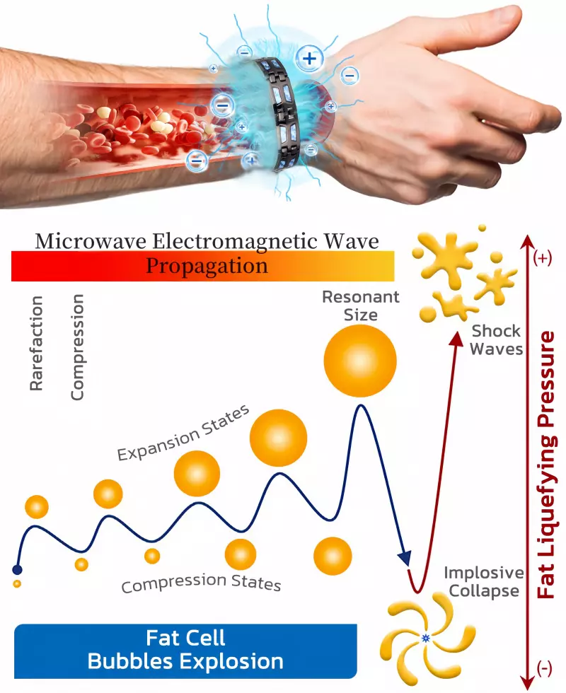 Microelectromagnetic waves create tiny bubbles within fat cells. These bubbles expand rapidly, causing the fat cells to rupture and disintegrate. Once the fat is broken down, the body naturally eliminates it, reducing stubborn fat deposits. - Liquefying Fat: