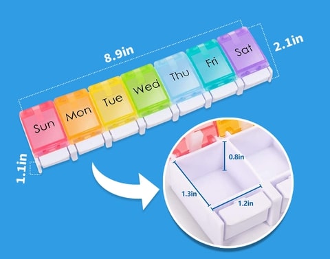 Each pane shows the days of the week, from Sunday to Saturday, in different colors. It will help you easily access your pills at a glance. The push button allows you to open the compartment effortlessly. Once locked it stays closed and closes securely to keep the pills safe.