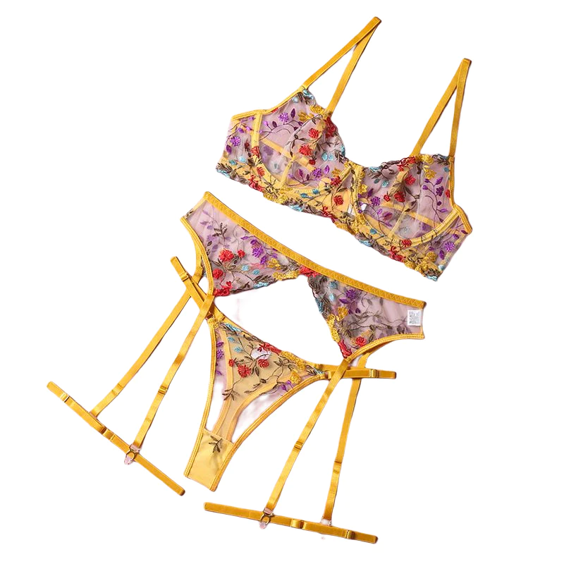 The whole Underwear set is made of sheer mesh design with Delicate floral embroidery. Choose this lingerie set for an unexpected night out.