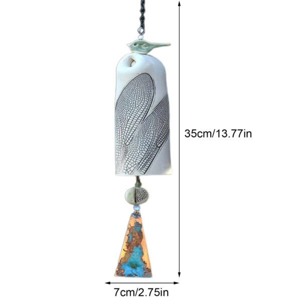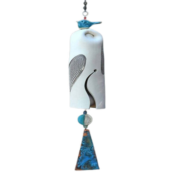 It features a beautiful dragonfly wing pattern accentuated by a patina’s copper wind sail. A small bird carved from resin in glazed blue or glazed green or Rustic Red sits atop the bell.