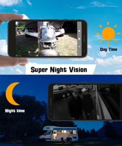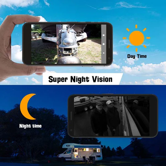 The device is waterproof and can withstand most weather elements. It has 12 infrared lights that provide great night vision of up to 30ft even on the darkest night! Mount it above the entrance of your trailer to keep a look out at night!