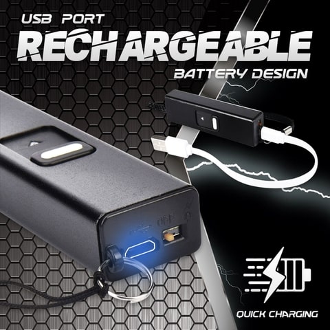 The Self Defense Mini Flashlight is built with a large-capacity lithium polymer battery, a quick-charge mini-usb port design, and can be conveniently charged from most mobile phone chargers.