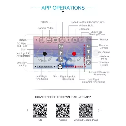 Functions: Sideward flight, Sideward rollover, Turn left/right, Up/down, Forward/backward, WIFI FPV, Gravity Sense Control, Headless Mode, Altitude Hold