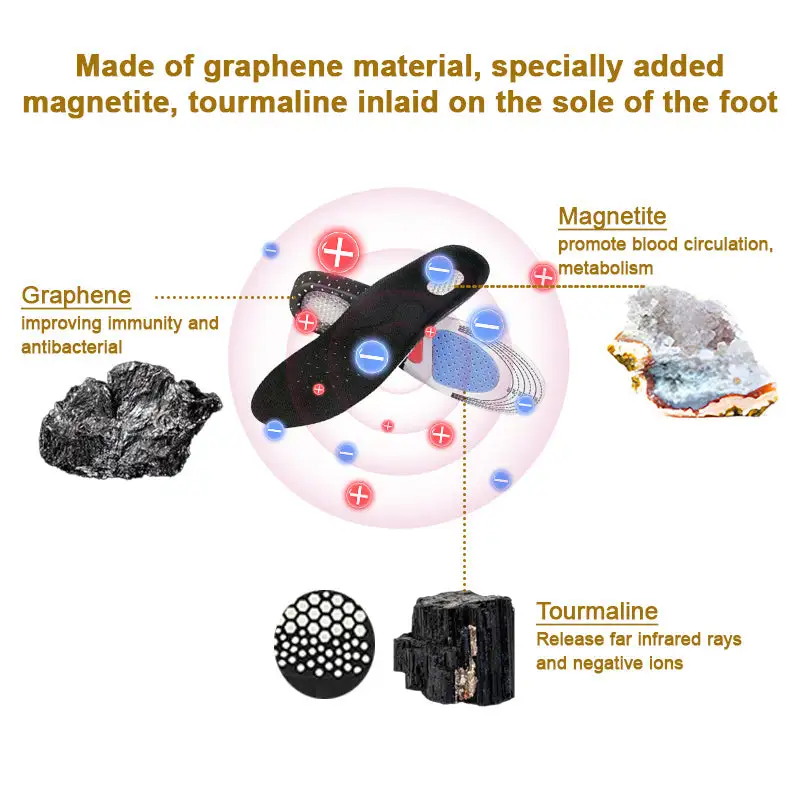 This type of Insole is crafted with meticulous care using graphene material, which means that Insole made from it can be more durable than regular Insoles and can help regulate foot temperature to keep them cool, reducing discomfort or sweat caused by high temperatures. Graphene has inherent antibacterial properties that can help reduce bacterial growth, thus minimizing odor and maintaining foot hygiene. The bottom dots store natural magnetic minerals and tourmaline to promote a magnetic field and far infrared response through the temperature provided by the body surface to promote natural changes in the body’s fat cells.