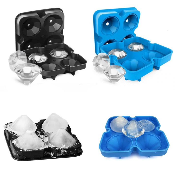 The diamond ice cube trays worked best when I filled the bottom half first, put the top half on, and filled the top half using the small cones that were included. I experimented with using a small amount of blue dye. The diamond ice popped with the hint of blue.