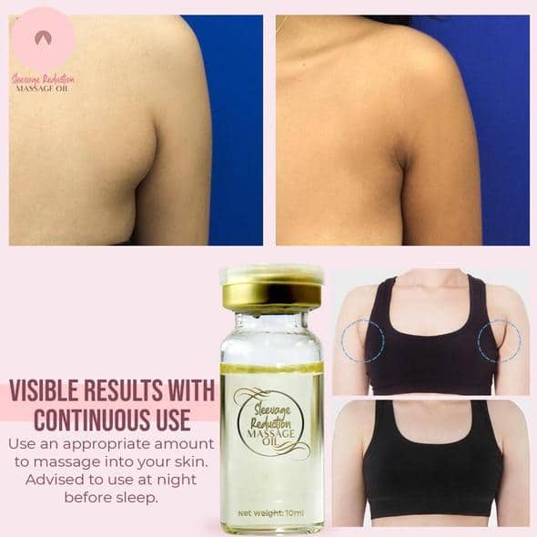 Sleevage Reduction Massage Oils. Are you embarrassed to take your shirt off at the beach, bedroom or playing sports? Here’s a solution to the bulky, flappy extra fat of skin under your arms.
