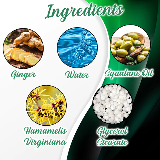 - Ingredients: Ginger, Water, Squalane Oil, Hamamelis Virginiana, Glycerol Stearate