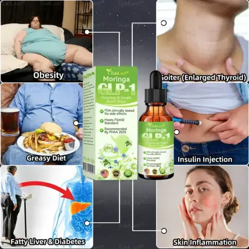 BuildLeaf® Moringa GLP-1 Slimming & Health Boost Drops help control blood sugar by boosting insulin secretion and inhibiting glucagon release, stabilizing blood sugar levels. GLP-1 also delays gastric emptying and increases satiety, reducing food intake and promoting weight loss. Weight loss improves insulin sensitivity, lowers blood sugar, and reduces diabetes complications, making BuildLeaf® an effective tool in diabetes management.