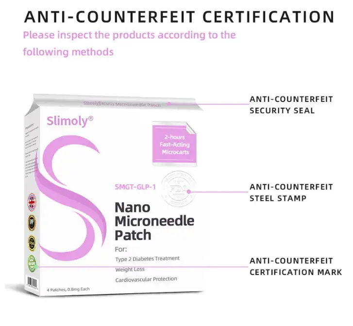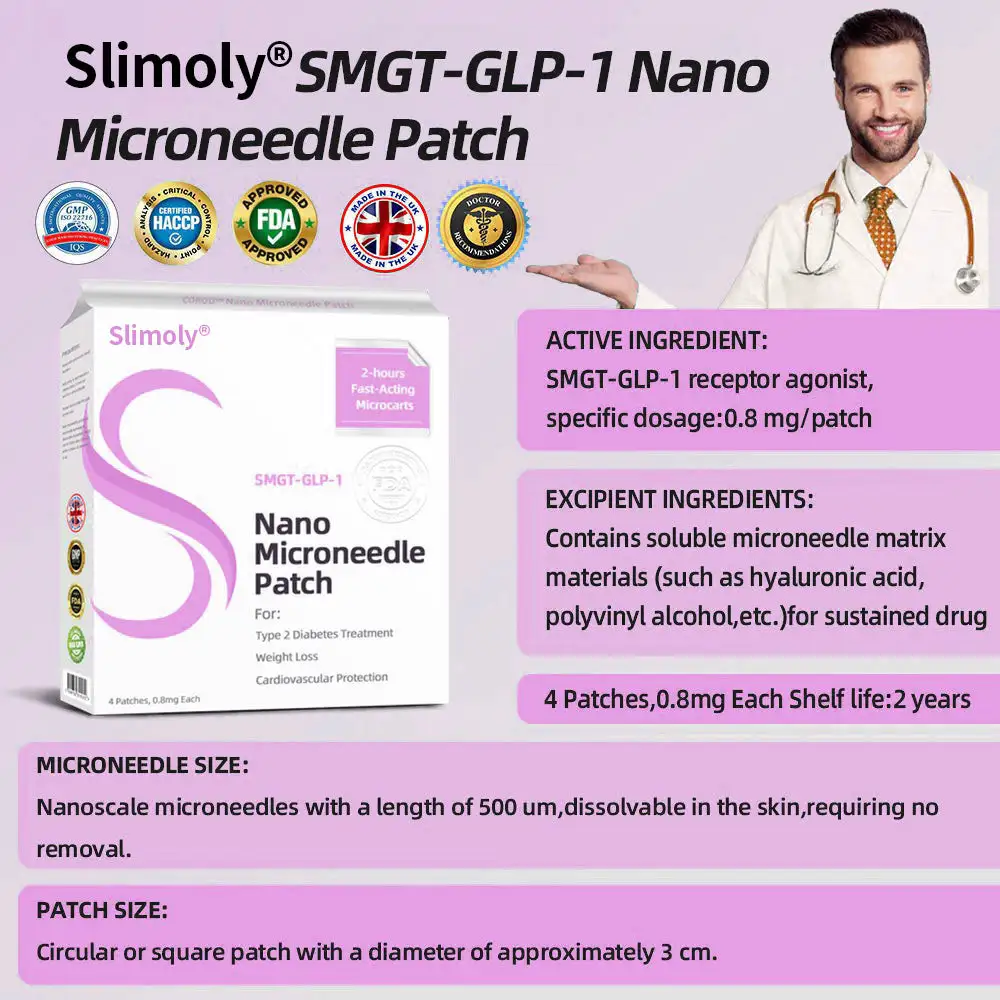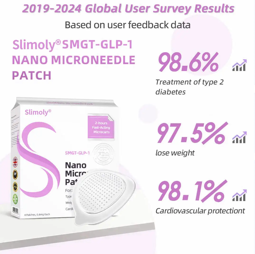 The Slimoly™ SMGT-GLP-1 Nano Microneedle Patch offers a long-lasting. slow release of the medication. ensuring a stable effect over 24 hours without causing any discomfort. With the same dosage and price. it can maintain up to 20 times longer-lasting effects (similar to the difference between an IV drip and a single injection).
