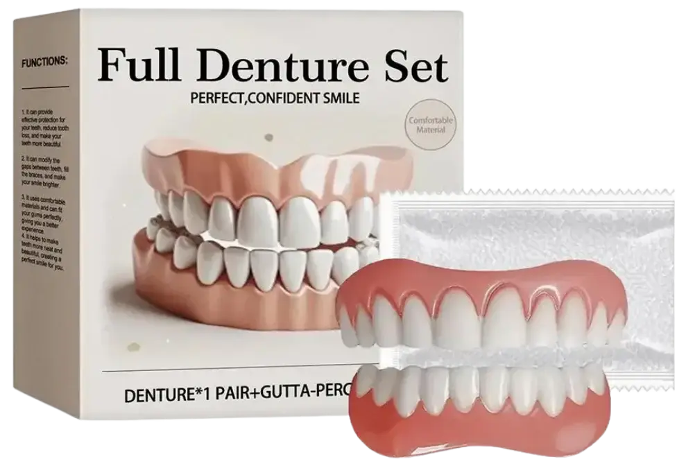 The Denture Set Complete Smile System is the ultimate all-in-one solution for maintaining and enhancing your smile. It includes a meticulously crafted full set of teeth, designed to provide both functional and aesthetic benefits.