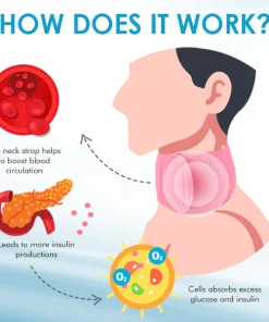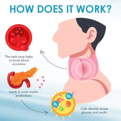 The SugarDown™ Treatment Neck Strap works by targeting specific acupuncture points in the neck that are known to stimulate the pancreas to produce more insulin and increase the sensitivity of cells to insulin. The acupuncture points targeted by the neck strap are located near the thyroid gland, and when stimulated, can have a positive effect on glucose metabolism.
